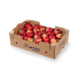 Skallet virker oljet og er rødt med innslag av gult. Fruktkjøttet er saftig.