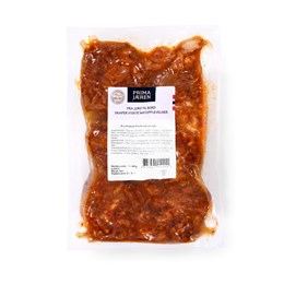 Kjøtt av svin (85%), vann, stivelse, vegetabilsk fiber, modifisert stivelse E1412, sukker, stabilisator E450, krydder (chilli, røkt paprika, hvitløk, sort papper, allehånde, kanel), gjærekstrakt, tomat, løk, tomatpulver, brun farin, fettredusert kakaopulver, oregano, paprikaekstrakt (oleoresin), rapsolje, salt.)