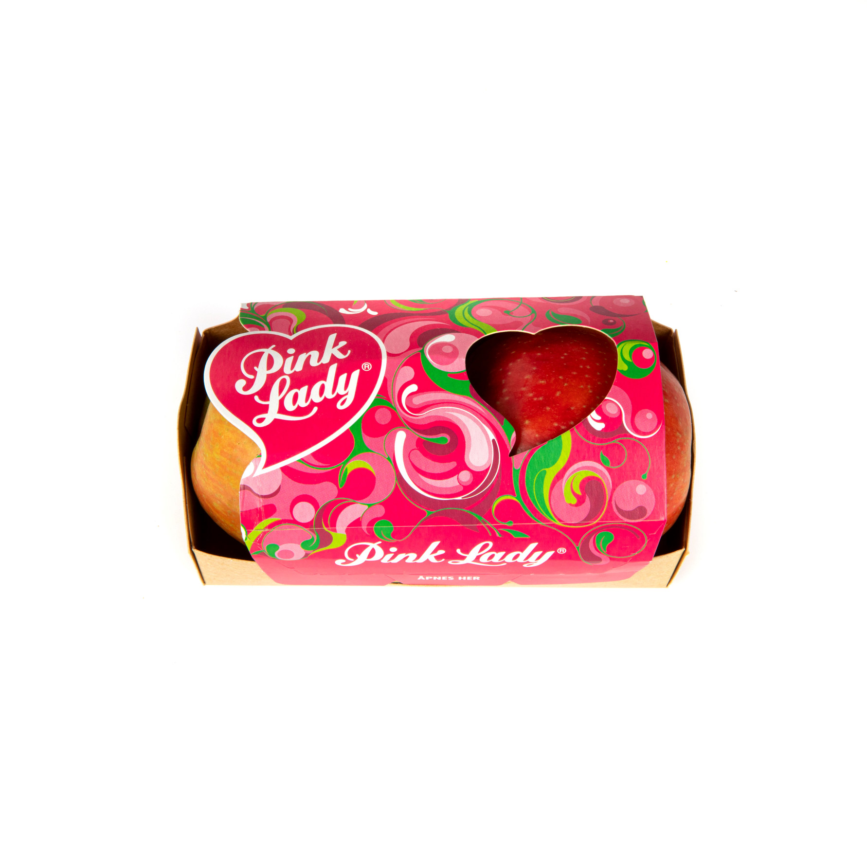består av to stykk epler per pakning.