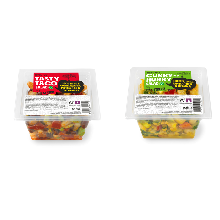 BAMA lanserer 2 stk nye veganske produkter : bønne og kikertsalat med spennende smak av taco og karri.