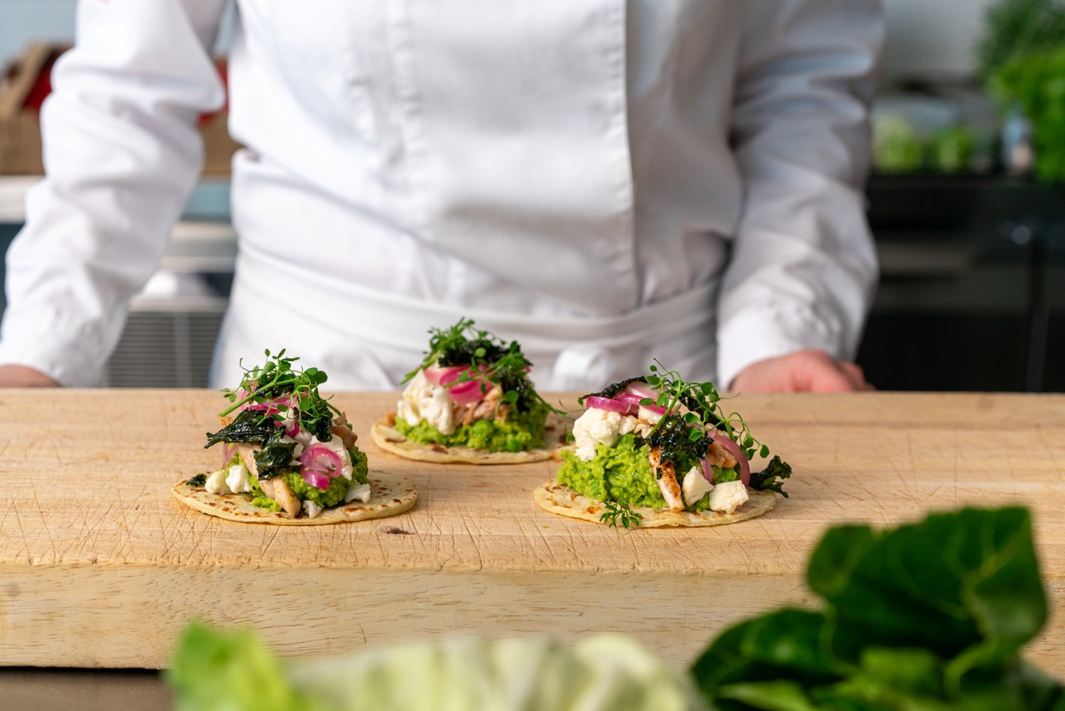 Nordisk taco med erteguacamole, blomkål, syltet løk, kylling og sprø grønnkål