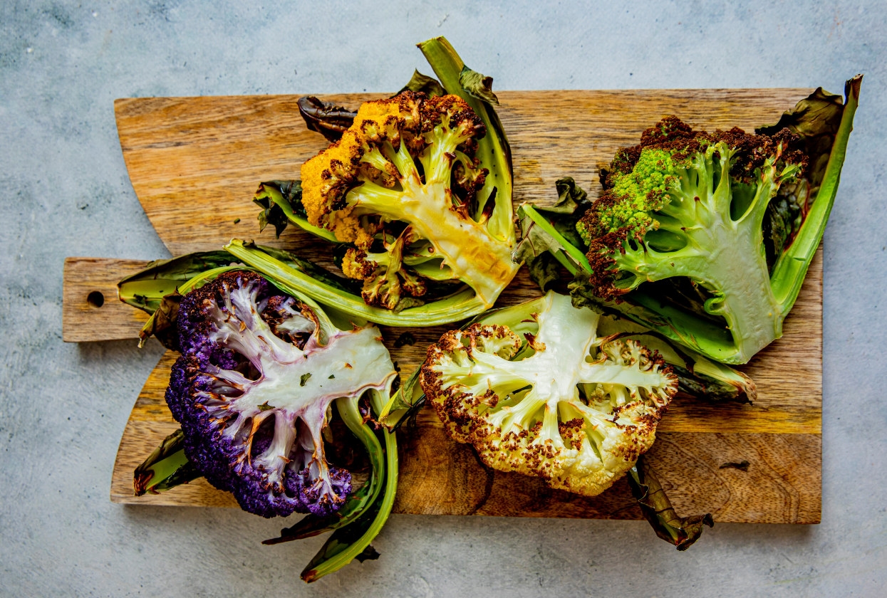 Nå er de første kassene med lilla, gul, grønn og oransje blomkål på vei inn til oss. Våre fargede blomkål kommer fra Gilhus gård i Lier.