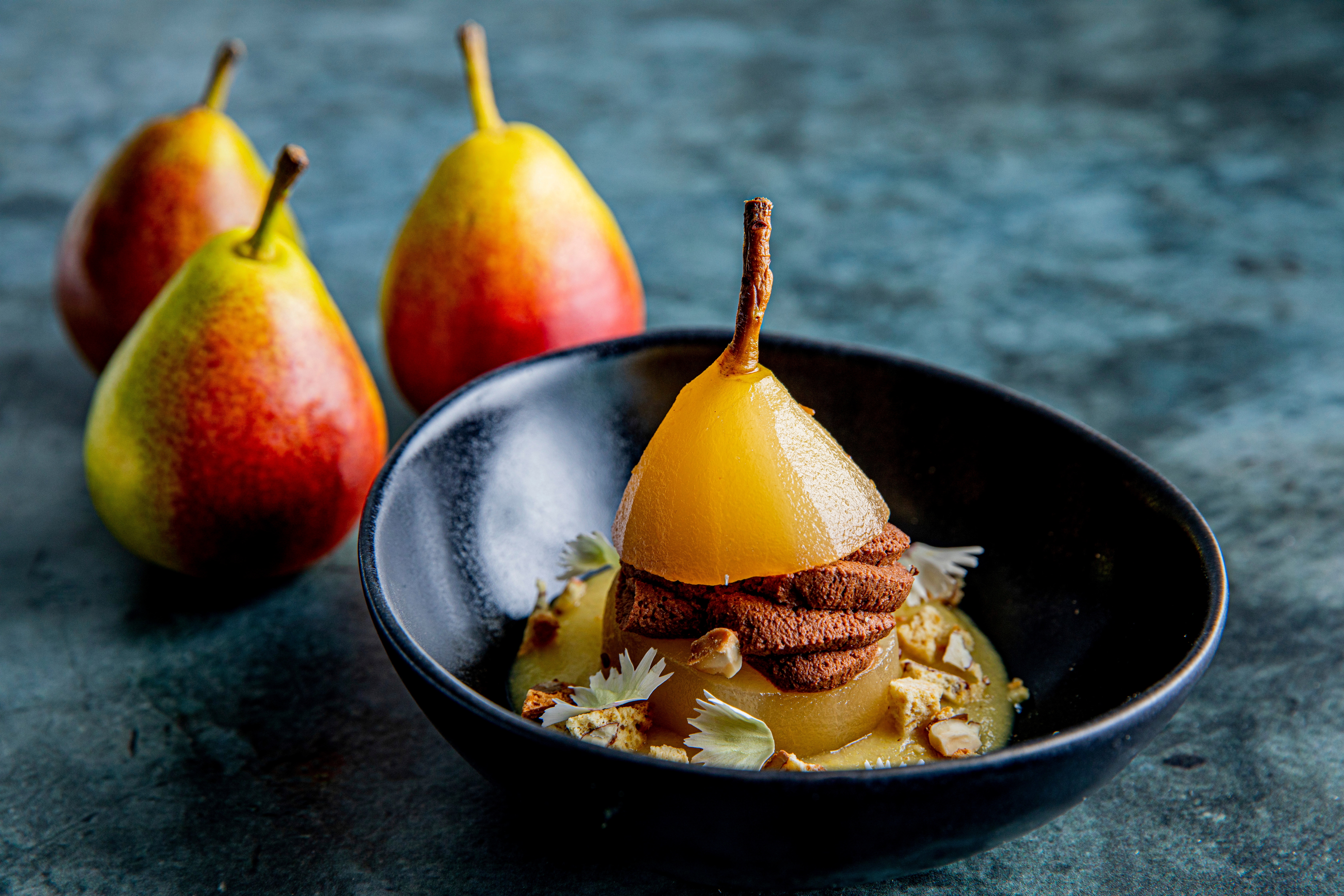 Våre kokker anbefaler: Norsk Celinapære syltet med krydder, servert med sjokolademousse og pærepuré